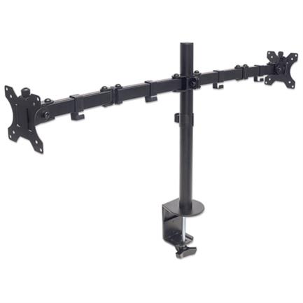 Un escritorio organizado. Maximiza la productividad. La instalación del monitor LCD sobre el escritorio ayuda a maximizar la efectividad y el potencial del espacio de trabajo. El soporte universal para Monitor dual de Manhattan con brazos de doble articulación mejora la organización en el escritorio, lo que facilita el trabajo en la computadora. Construido a partir de metal fundido, este soporte de doble monitor cuenta con una abrazadera resistente que permite un montaje rápido, fácil y seguro sin la necesidad de perforar agujeros en escritorios o mesas. Sus ajustes de inclinación, rotación, lado a lado, altura y tensión totalmente ajustables crean la posición perfecta para aumentar la productividad cómodamente. Tales capacidades de ajuste incluso pueden ayudar a reducir la fatiga ocular o la tensión del cuello y la espalda. Además, el poste de montaje ofrece una rotación fácil del monitor para permitir que otros vean presentaciones y producciones multimedia desde casi cualquier direcc